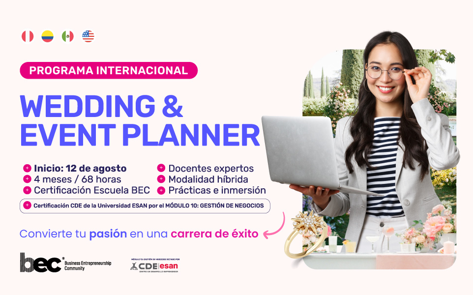 Escuela BEC cuenta con el respaldo de la marca BODAS®, empresa líder en la industria de bodas y eventos con más de veinticinco de experiencia. Además tiene el respaldo de CAPEV (Cámara de Profesionales de Evento del Perú); y tenemos como aliado estratégico educativo al Centro de Desarrollo Emprendedor de ESAN.